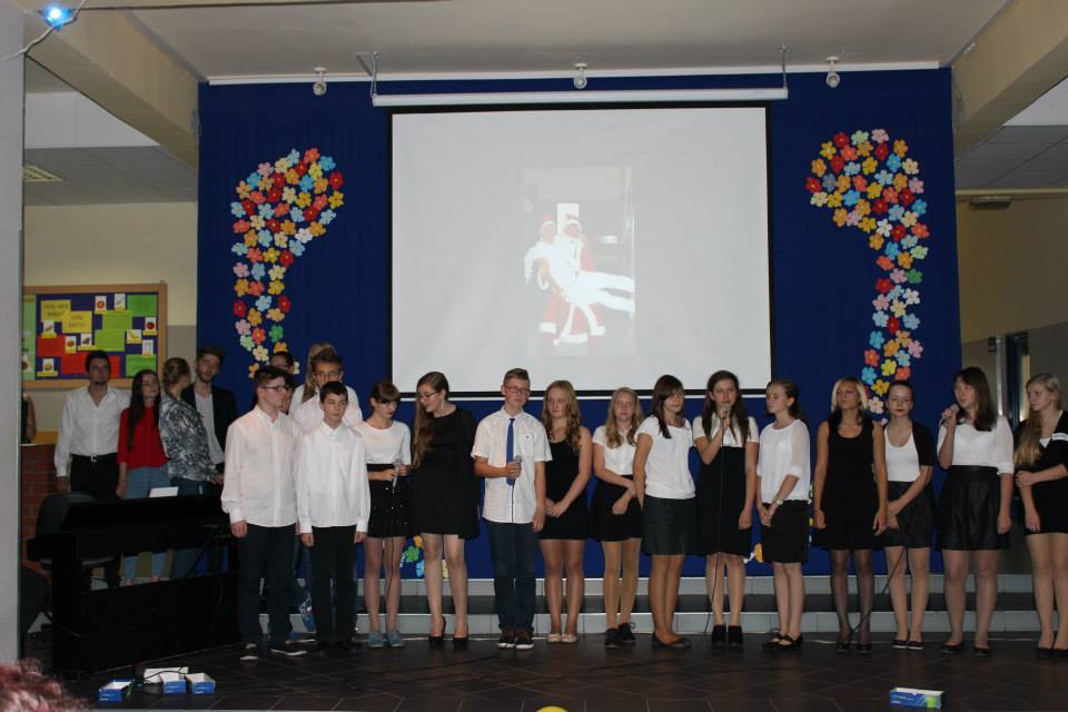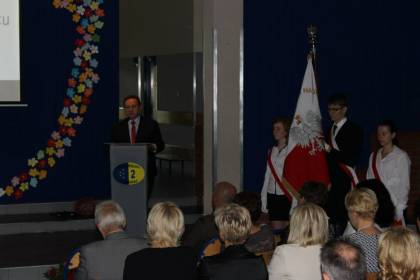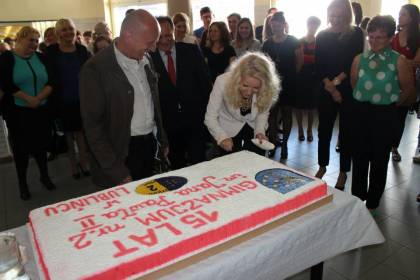 Wszyscy goście mieli okazję, by zabrać głos, wręczyć kwiaty czy pamiątkowy upominek dla szkoły. Następnie Dyrektor Gimnazjum nr 2 – p. Agnieszka Stelmaszczyk, w związku z tym, że 15-lecie szkoły było doskonałą okazją do wspomnień i podsumowań, krótko przypomniała historię gimnazjum, osiągnięcia uczniów, projekty edukacyjne oraz współpracę międzynarodową. Dyrektor szkoły poszczycił się absolwentami naszej szkoły, którzy osiągnęli sukces w życiu oraz tymi, którzy nadal pogłębiają swoja wiedzę. Po części oficjalnej, wszyscy udali się na poczęstunek i rozmowy w kuluarach. Najwspanialszy był rocznicowy tort którego kawałek mógł pokosztować każdy uczestnik uroczystości.
