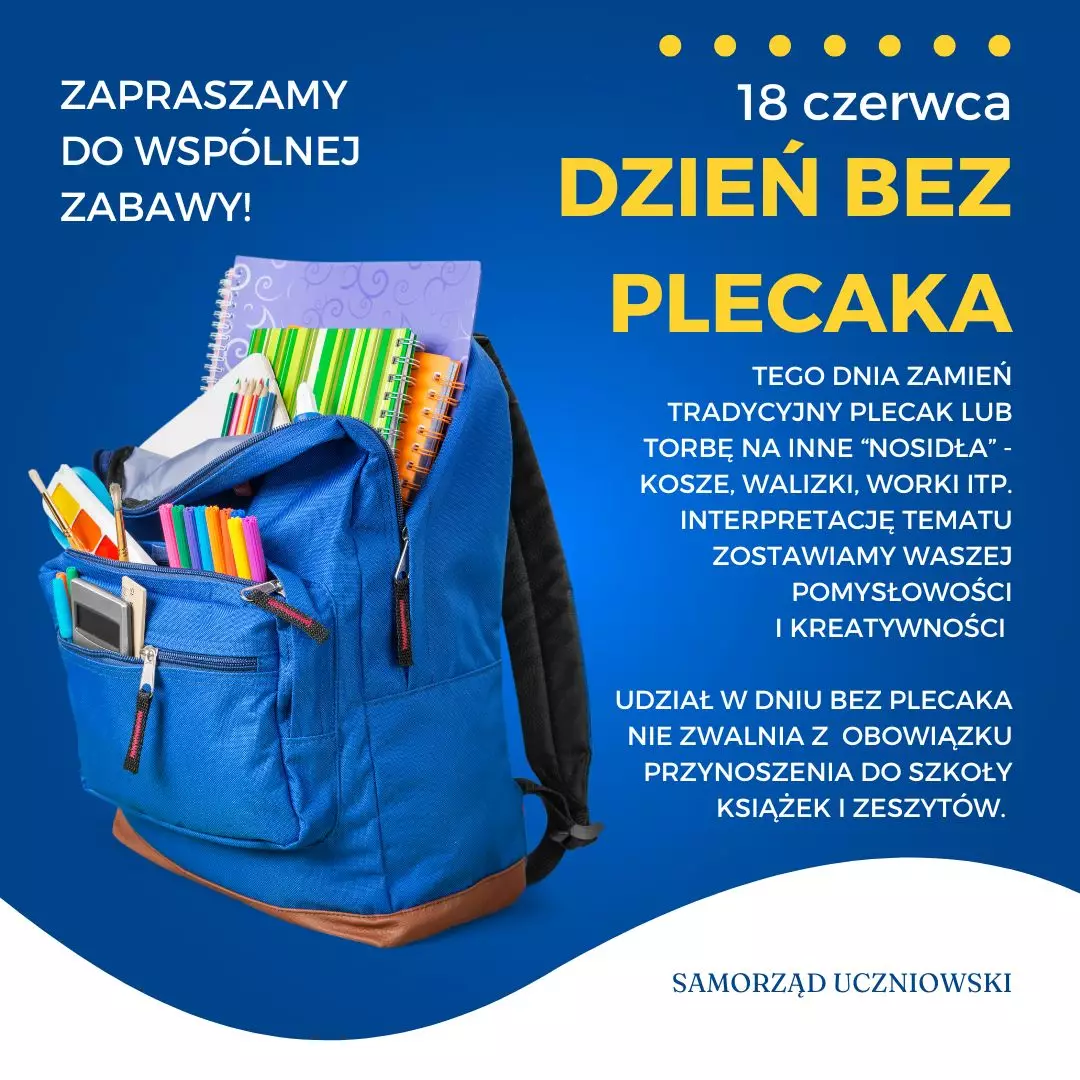 Pamiętajcie, że udział w dniu bez plecaka nie zwalnia z obowiązku przynoszenia do szkoły książek i zeszytów!