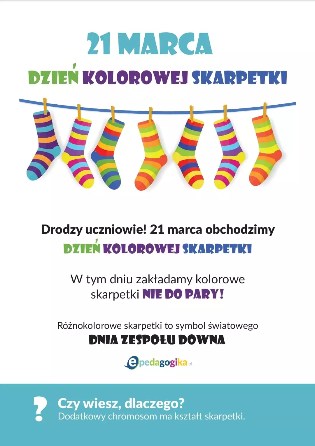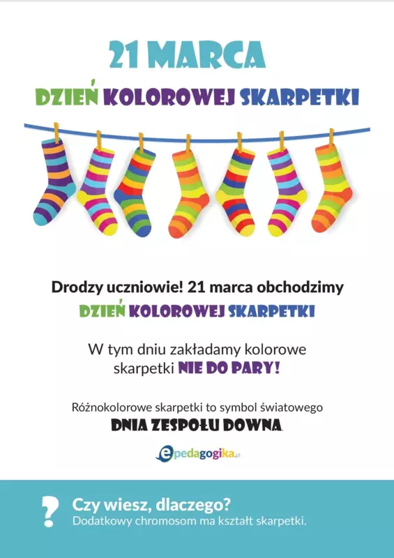 Dzień Kolorowej Skarpetki, czyli Światowy Dzień Zespołu Downa nie bez przyczyny obchodzi się 21 marca. Data ta symbolizuje trisomię 21 chromosomu, którego dodatkowa kopia znajduje się w komórkach osób z Zespołem Downa. Ta symboliczna data przypomina, jak ważne jest dbanie o równe szanse w społeczeństwie przy zachowaniu różnorodności.