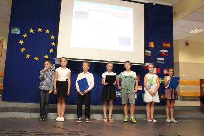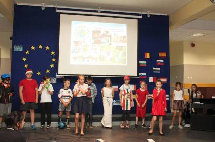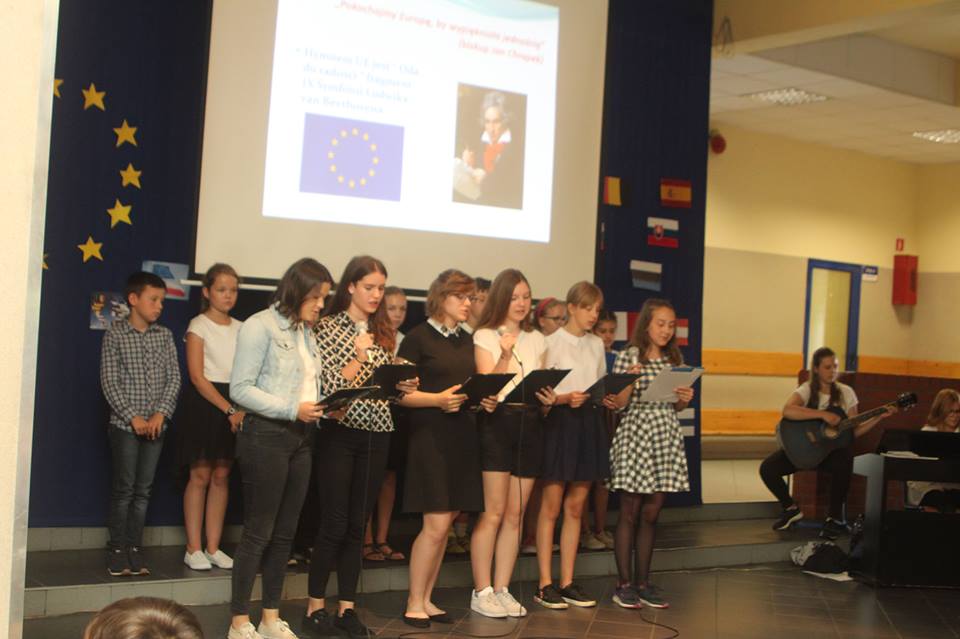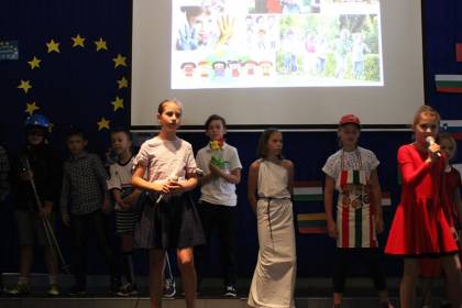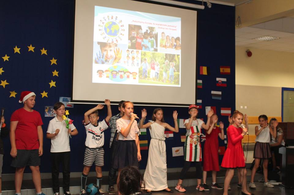 W kolorową podróż po Europie wyruszyli dzisiaj uczniowie naszej szkoły. W trakcie apelu zorganizowanego z okazji "Dnia Unii Europejskiej" przez klasę 4A dowiedzieliśmy się, jak powstała UE, jakie mamy korzyści z bycia obywatelami Unii. Charakterystyczne postacie związane z państwami członkowskimi przedstawiły nam najważniejsze informacje na temat ich kraju, a także ich symbole narodowe. Przy akompaniamencie gitary i pianina wysłuchaliśmy hymnu Unii Europejskiej w językach: polskim, angielskim i niemieckim.