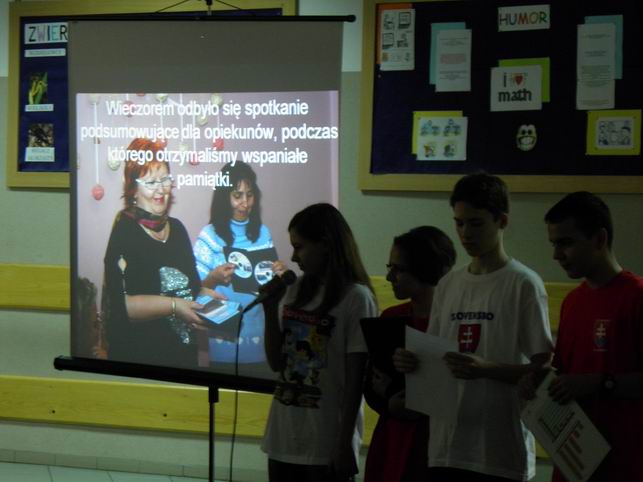 Na lekcjach wychowawczych przeprowadziliśmy krótki apel dotyczący naszego pobytu na Słowacji. Zaprezentowaliśmy najciekawsze zdjęcia i opowiedzieliśmy o tym, co działo się podczas naszej wizyty w Martin. Udało nam się również zaprezentować krótki film z naszego wyjazdu. Pomimo dużego stresu, wszystko przebiegło sprawnie i po naszej myśli .