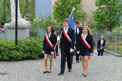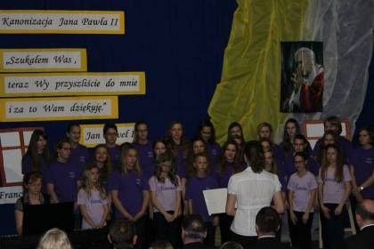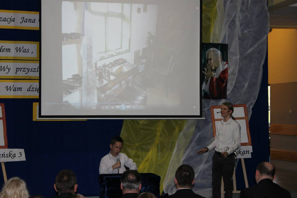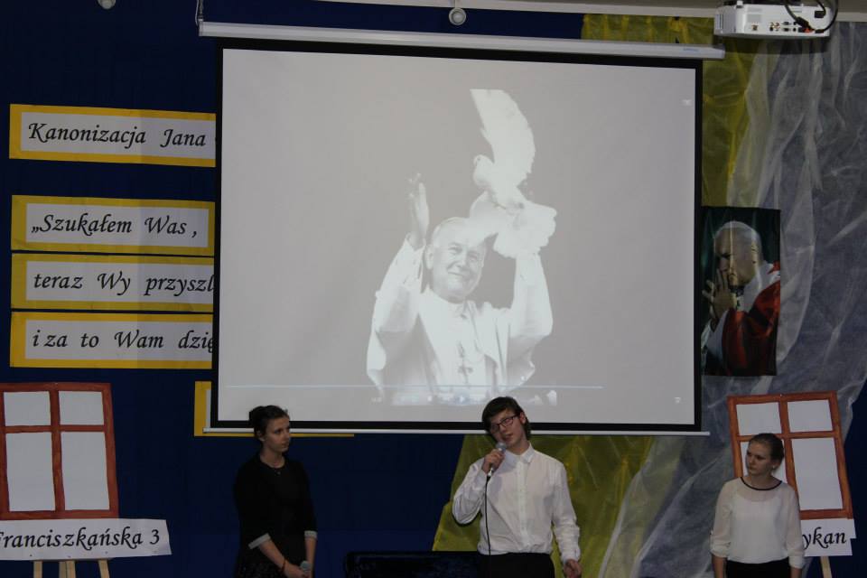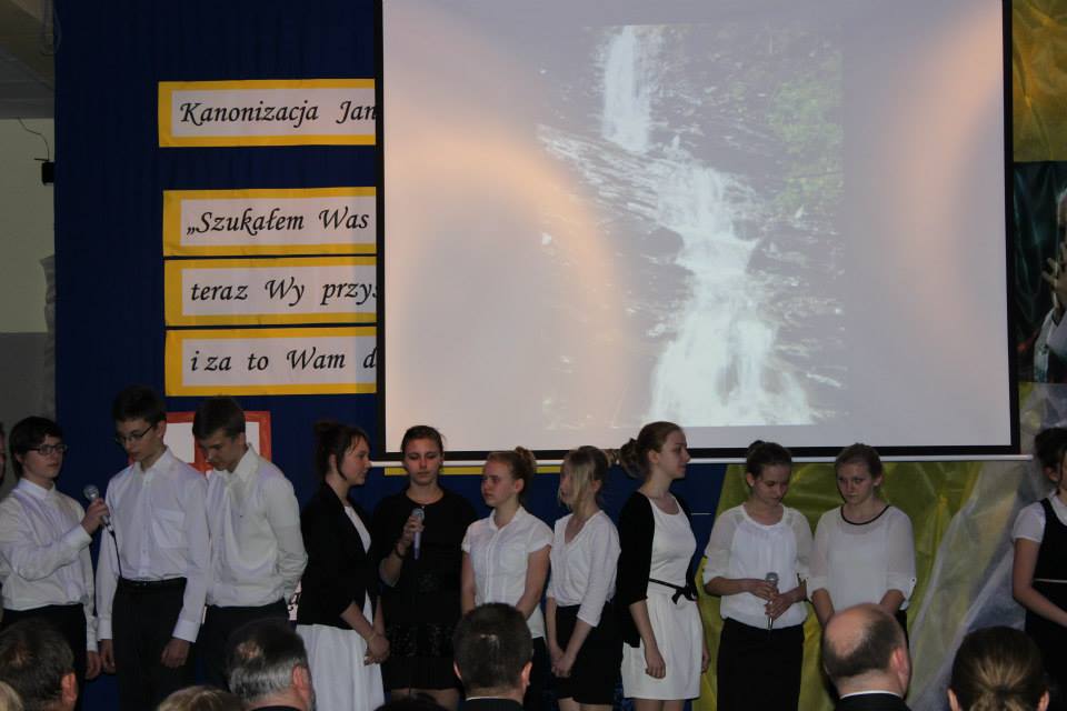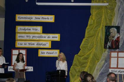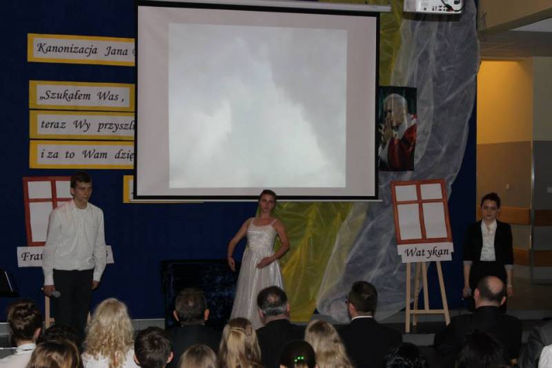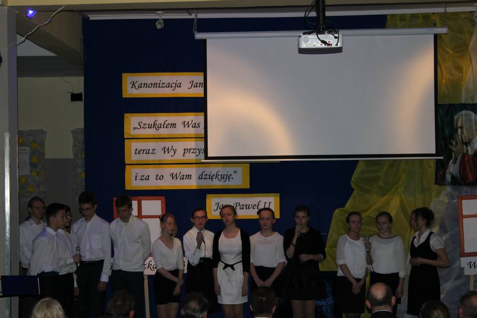 W dniu 28.04.2014r. w Gimnazjum nr 2 odbyły się uroczystości związane z uczczeniem Kanonizacji Jana Pawła II. Uczniowie, nauczyciele oraz Dyrekcja szkoły wzięli udział w Mszy Św. koncelebrowanej w Parafii Podwyższenia Krzyża Świętego w Lublińcu, na której uczczono relikwie Jana Pawła II. Następnie wszyscy udali się do budynku Gimnazjum nr 2 na akademię, która została przygotowana przez uczniów pod kierunkiem mgr Agaty Kwolek, mgr Grażyny Gerhards i mgr Adriany Wręczyckiej. Przedstawienie w wykonaniu zespołu „Trapez” przybliżyło sylwetką Jana Pawła II nie tylko jako głowę Kościoła, ale również jego dzieciństwo i lata młodzieńcze. Dzięki spektaklowi uczniowie przekonali się że, Święty Jan Paweł II był człowiekiem pełnym humoru i radości życia. Przedstawienie zostanie zaprezentowane ponownie 2 maja 2014 o godz. 16.00 na Bulwarze Grotowskiego. W uroczystej akademii wzięli udział przedstawiciele władz Miasta: Pan Burmistrz Edward Maniura, Pani Wiceburmistrz Anna Jonczyk - Drzymała, Przewodniczący Rady Miejskiej, Radni władze Kościoła, Rada Rodziców oraz zaproszeni goście z miasta partnerskiego Kravare. Nasi czescy goście przygotowali krótki występ wokalny, który zachwycił wszystkich uczestników spotkania. Po zakończeniu części oficjalnej, każdy mógł spróbować papieskiej kremówki. Goście z Kravare wraz z młodzieżą Gimnazjum nr 2 udali się na wspólny spacer po mieście. Obejrzeli m.in. Zamek Lubliniecki, Bulwar Grotowskiego oraz Kościółek Świętej Anny. Wizyta w naszym mieście była również okazją do spróbowania kuchni śląskiej.