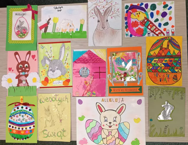 Z radością informujemy, że w Naszej Szkole został przeprowadzony konkurs pt. "Najpiękniejsza kartka wielkanocna". Uczniowie wykazali się ogromną kreatywnością i zaangażowaniem – wykonane przez nich kartki były niezwykle piękne, staranne i estetyczne. Prace łączyły różnorodne techniki plastyczne, co nadało im wyjątkowy i niepowtarzalny charakter. Serdecznie dziękujemy wszystkim uczestnikom za udział i gratulujemy talentu!