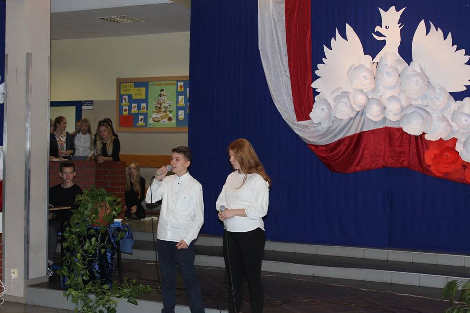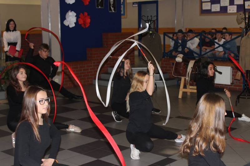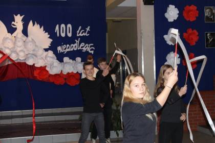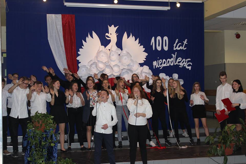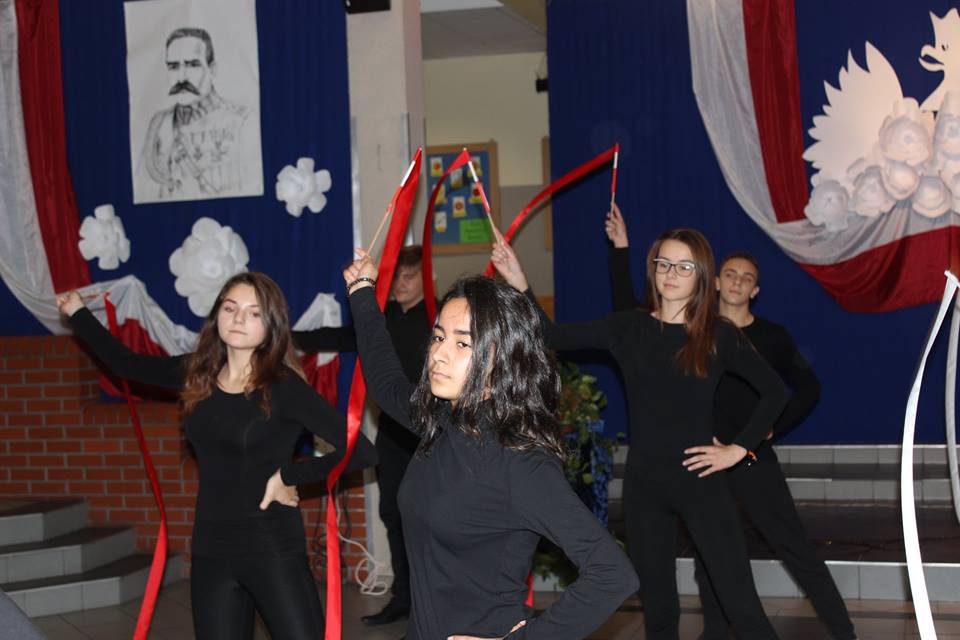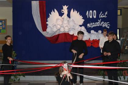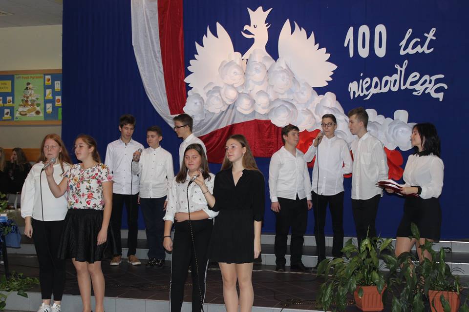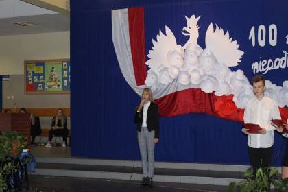 Narodowe Święto Niepodległości to dla Polaków jedno z najważniejszych świąt państwowych. Po 123 latach zaborów - niewoli naznaczonej walką, cierpieniem i wysiłkiem wielu pokoleń Polek i Polaków - nasz kraj odzyskał suwerenność. Aby uczcić ten dzień uczniowie najstarszych klas naszej szkoły przygotowali przepiękny program artystyczny. W widowisko wplecione były patriotyczne piosenki, recytacje, ruch sceniczny, taniec , a majestatyczne dekoracje uzupełniały całość akademii. Ten niecodzienny i z rozmachem przygotowany spektakl zaplanowała i przygotowała mgr Bogumiła Majewska, zaś oprawą muzyczną zajęła się mgr Grażyna Gerhards.