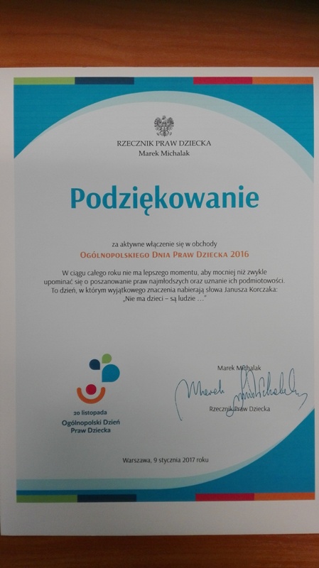 Za włšczenie się w obchody Ogólnopolskiego Dnia Praw Dziecka otrzymalimy podziękowanie od Rzecznika Praw Dziecka p. Marka Michalaka.