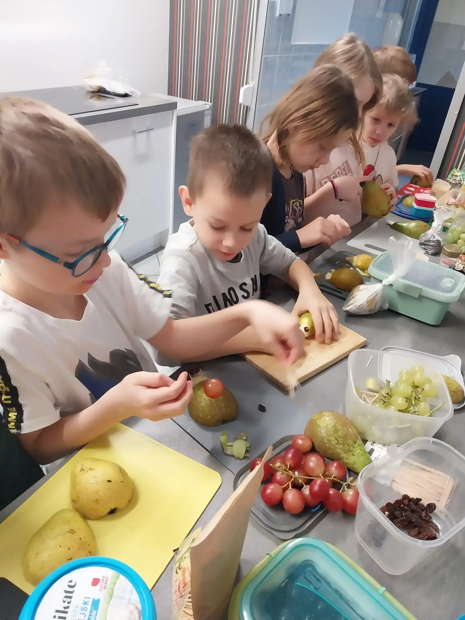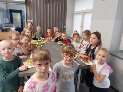 W klasie 1a odbyły się zajęcia poświęcone przygotowaniu zdrowej przekąski, podczas których uczniowie wykonywali owocowego jeża z gruszki oraz winogron, kiwi lub borówek . Praca wymagała precyzji, skupienia i samodzielności, dzięki czemu dzieci doskonaliły sprawność manualną oraz uczyły się bezpiecznego posługiwania się narzędziami kuchennymi. Zajęcia w szkolnej kuchni sprzyjały współpracy i integracji, ponieważ dzieci wymieniały się pomysłami i obserwowały, jak różnorodne mogą być efekty tego samego zadania. Przygotowane przekąski były również okazją do rozmowy o zdrowym odżywianiu i budowaniu dobrych nawyków już od najmłodszych lat. Zajęcia mogły zostać zrealizowane dzięki wsparciu programu Laboratoria Przyszłości.