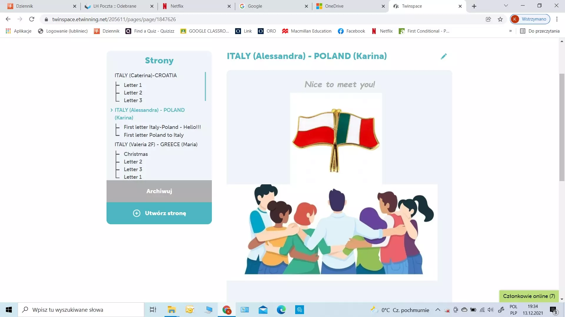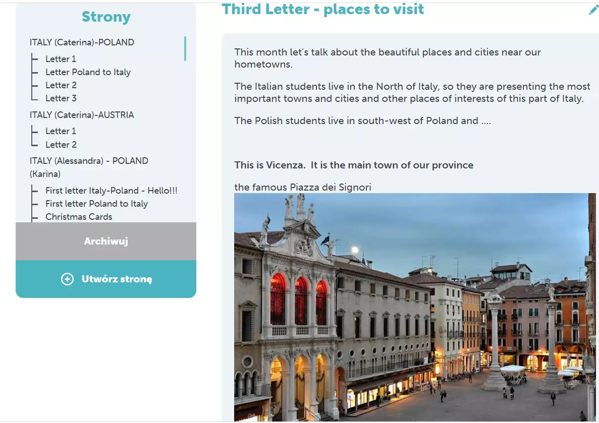 W tym roku szkolnym nasza szkoła brała udział w projekcie e-Twinning pt.„Pen (real) friends" . Projekt realizowany był wspólnie z włoską szkołą Istituto Comprensivo Statale ‘ Goffredo Parise’ Arzignano. Celem współpracy była wymiana listów pomiędzy uczniami w formie tradycyjnej i elektronicznej. Uczestnicy wymieniali swoje doświadczenie dotyczące zainteresowań, pasji i problemów nastolatków wykorzystując przy tym szeroki wachlarz narzędzi cyfrowych. Dodatkowo powstały filmy i prezentacje dotyczące holocaustu i praw człowieka. Miłym akcentem była również wymiana kartek świątecznych.