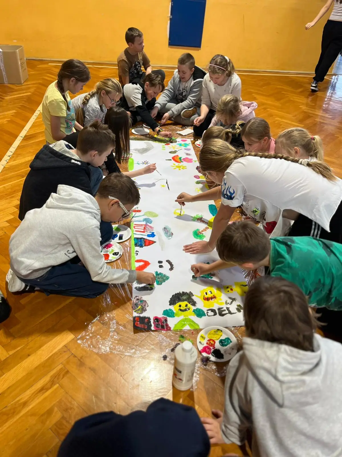 W klasach i na sali gimnastycznej odbyły się warsztaty plastyczne, podczas których uczniowie tworzyli prace inspirowane hasłem „Moje marzenia”. Zajęcia sprzyjały integracji, rozmowom o emocjach oraz budowaniu atmosfery wzajemnego wsparcia.
