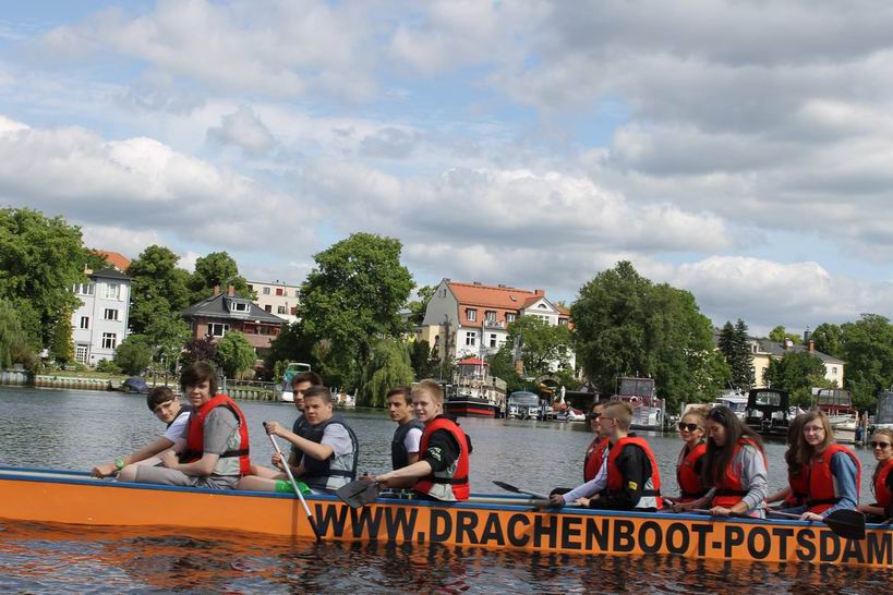 Wyspani, najedzeni i w pełni sił pojechaliśmy do Poczdamu, gdzie udaliśmy się nad pobliskie jezioro by tam poczuć się jak prawdziwi wioślarze. Zmęczeni, mokrzy, ale i uradowani po zmaganiach w wodzie wróciliśmy do ośrodka. Po zregenerowaniu sił przyszedł czas na warsztaty. Tego dnia współpracowaliśmy w mieszanych grupach, gdzie wzajemnie uczyliśmy się języka oraz lepiliśmy z modeliny „maskotkę” naszego spotkania. Wspólne zmagania bardzo nas do siebie zbliżyły i spowodowały, że atmosfera zrobiła się jeszcze przyjemniejsza. Na zakończenie dnia część z nas kąpała się w jeziorze, a inni grali bądź podziwiali grę w siatkówkę.