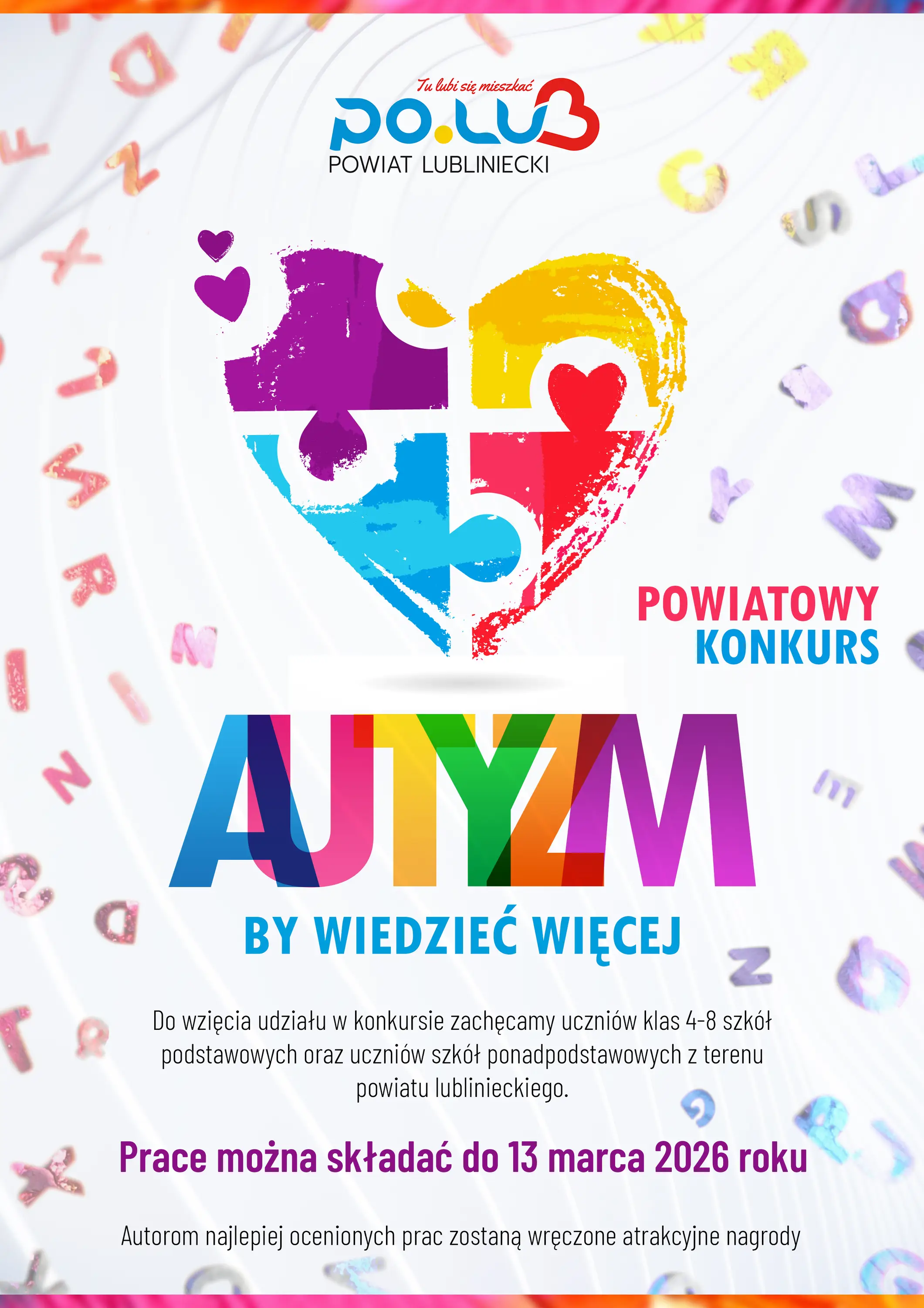 Serdecznie zapraszamy uczniów klas IV-VIII udziału w Powiatowym Konkursie „Autyzm – by wiedzieć więcej", organizowanym w ramach obchodów Światowego Dnia Świadomości Autyzmu.