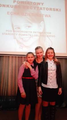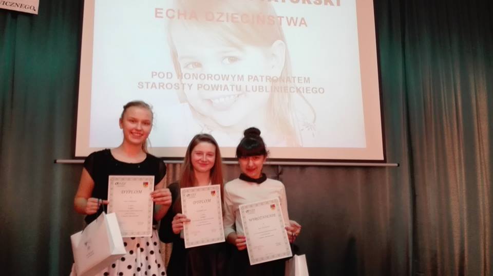 22 kwietnia uczennice naszej szkoły wzięły udział w XII edycji Konkursu Recytatorskiego "Echa Dzieciństwa" w CKZiU w Lublińcu. Przygotowania i wysiłek nie poszły na marne. II miejsce wywalczyła Emilia Jaworska, III miejsce Aleksandra Just i wyróżnienie – Julia Jajszczyk.