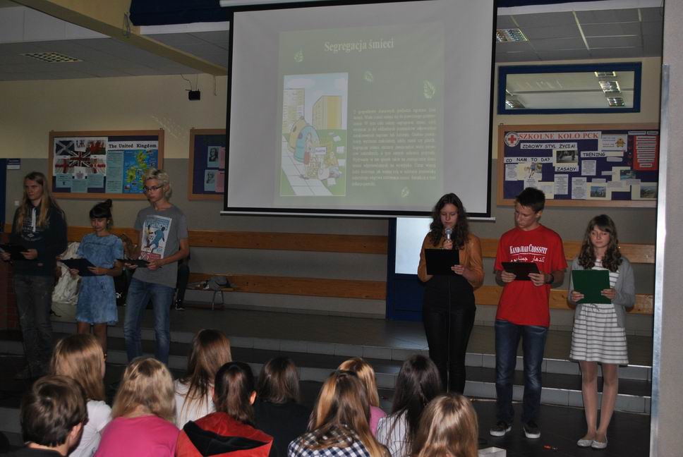 W tym roku w ramach działań poprzedzających akcję Sprzątania Świata uczniowie klas: 1c i 3b, przygotowali i przeprowadzili prelekcję dotyczącą szeroko rozumianej ochrony przyrody, zagrożeń związanych z działalnością gospodarczą człowieka oraz możliwości poprawy stanu środowiska. Uczniowie przypomnieli o idei i założeniach akcji Clean up the World.