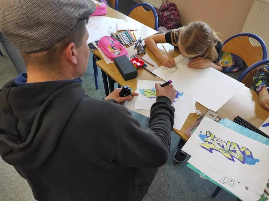 W ramach realizacji projektu "Moja szkoła i jej wartości" odbyły się warsztaty plastyczne,które poprowadził artysta - graficiarz Damian M. oraz Grzegorz B. Uczniowie podczas warsztatów poznali zasady i techniki wykonania graffiti oraz pod okiem fachowców wykonali wstępne szkice potrzebne do realizacji szkolnego przedsięwzięcia, którego inicjatorkami są pani Grażyna Gerhards i Joanna Szejok.