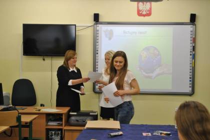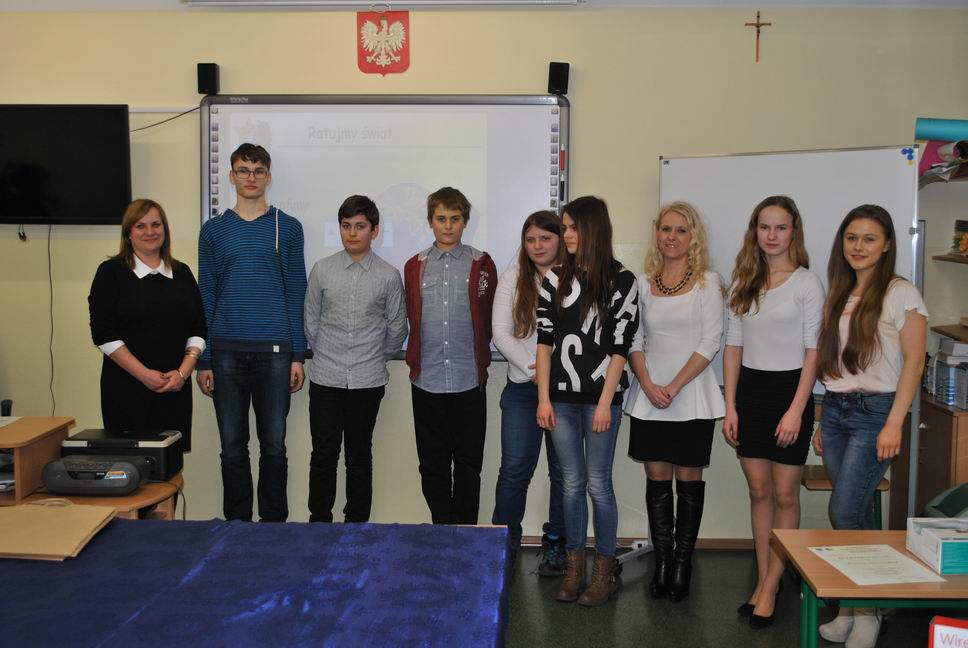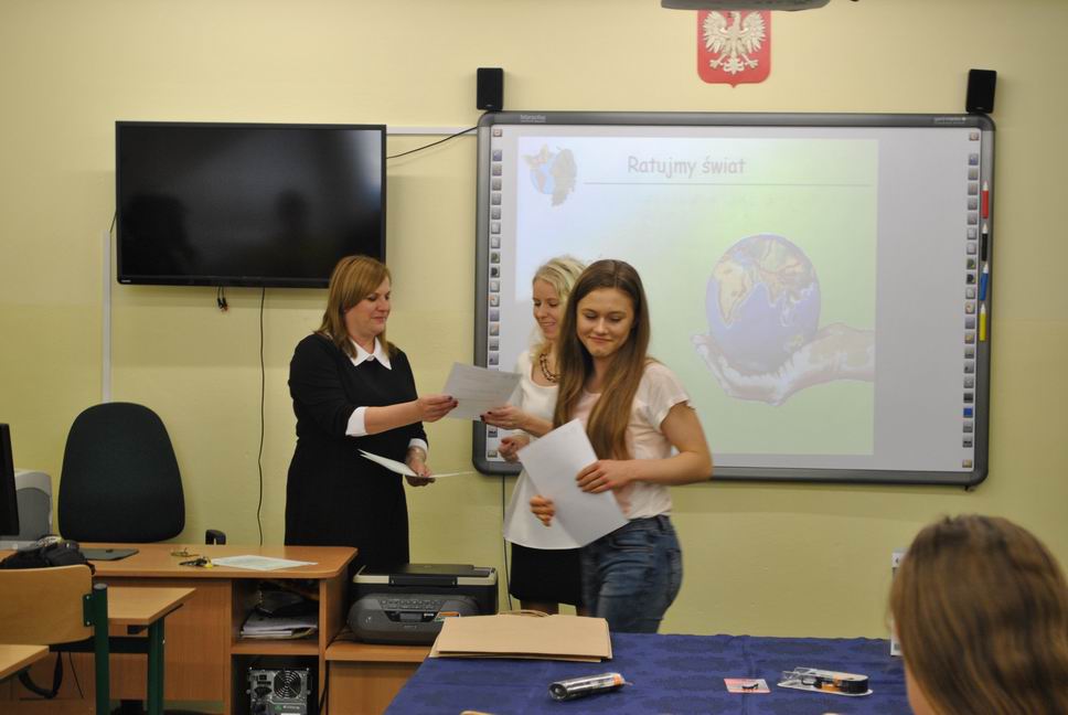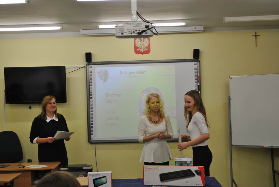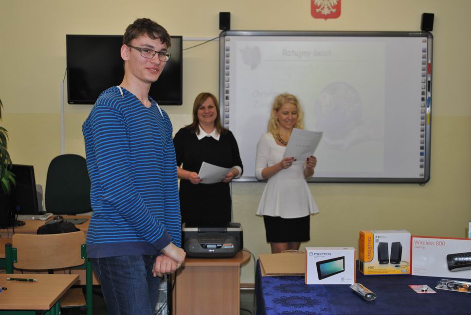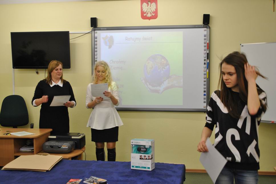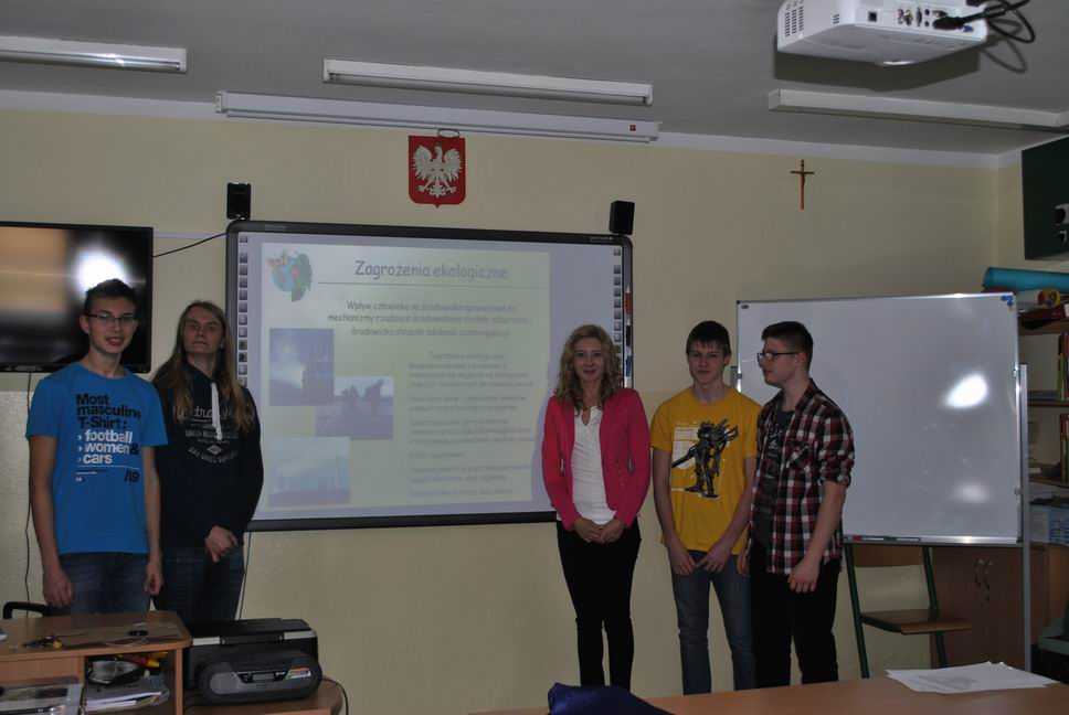 Po części pisemnej konkursu uczniowie naszego gimnazjum tj. Kacper Bącławek, Krystian Włodarczyk, Mateusz Gierat i Dominik Jelonek w formie prezentacji multimedialnej wygłosili interesującą prelekcję dotyczącą ochrony środowiska przyrodniczego.