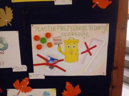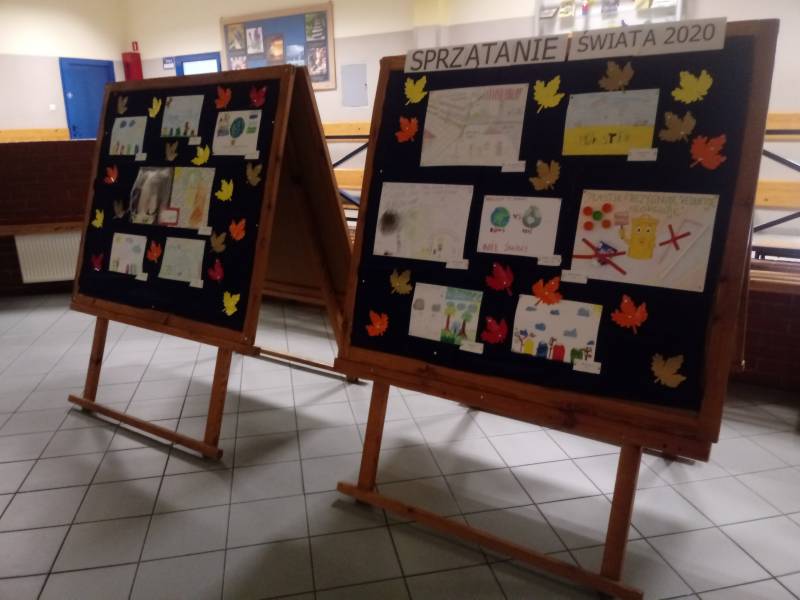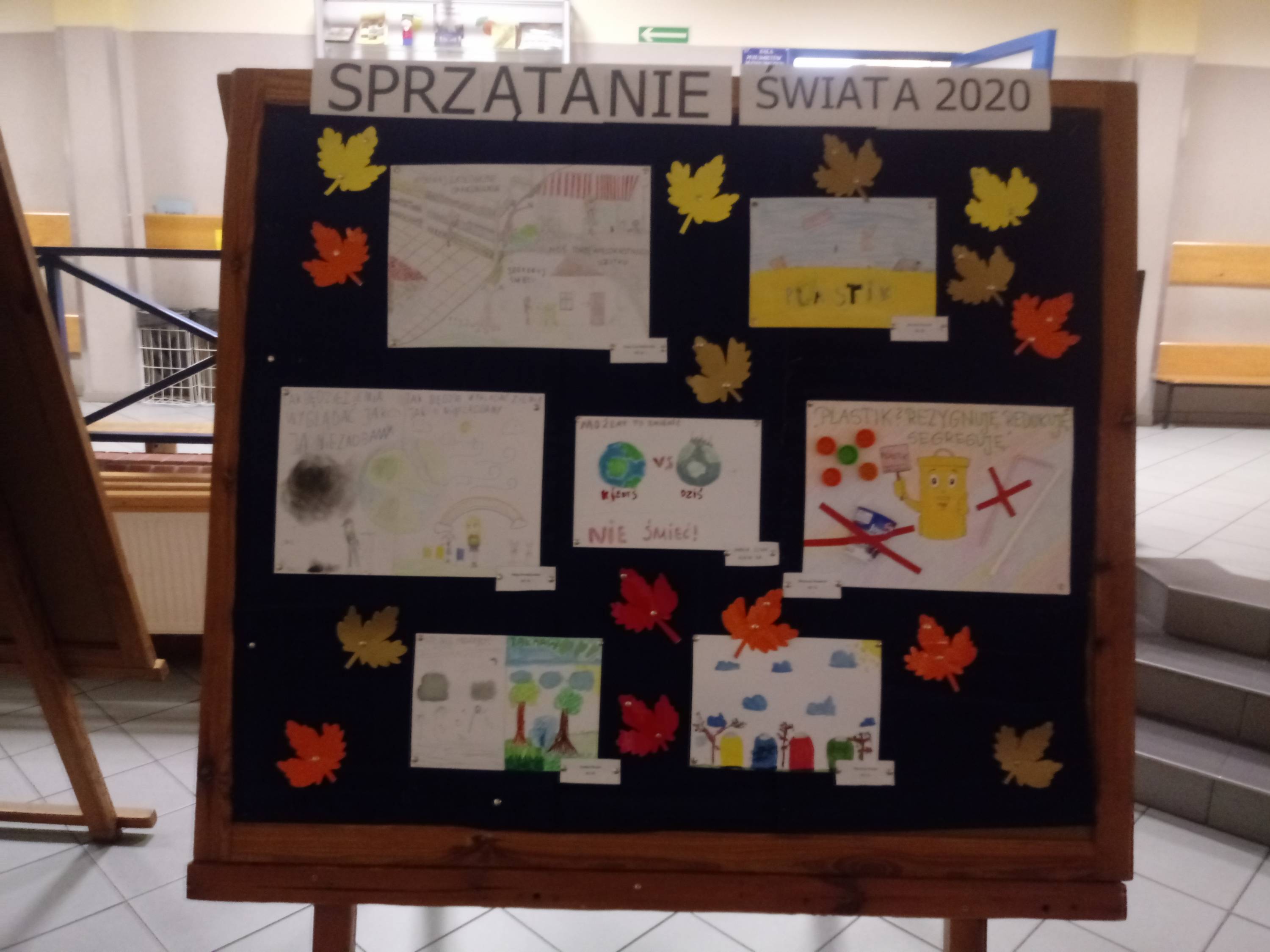 Młodsi uczniowie naszej szkoły wykonywali również prace plastyczne, których tematyka nawiązywała do hasła tegorocznej akcji Sprzątania Świata, czyli: "Plastik? Rezygnuję. Redukuję. Segreguję". Z wykonanych prac plastycznych na holu głównym szkoły przygotowano wystawę, na której wyeksponowano wytwory uczniów.