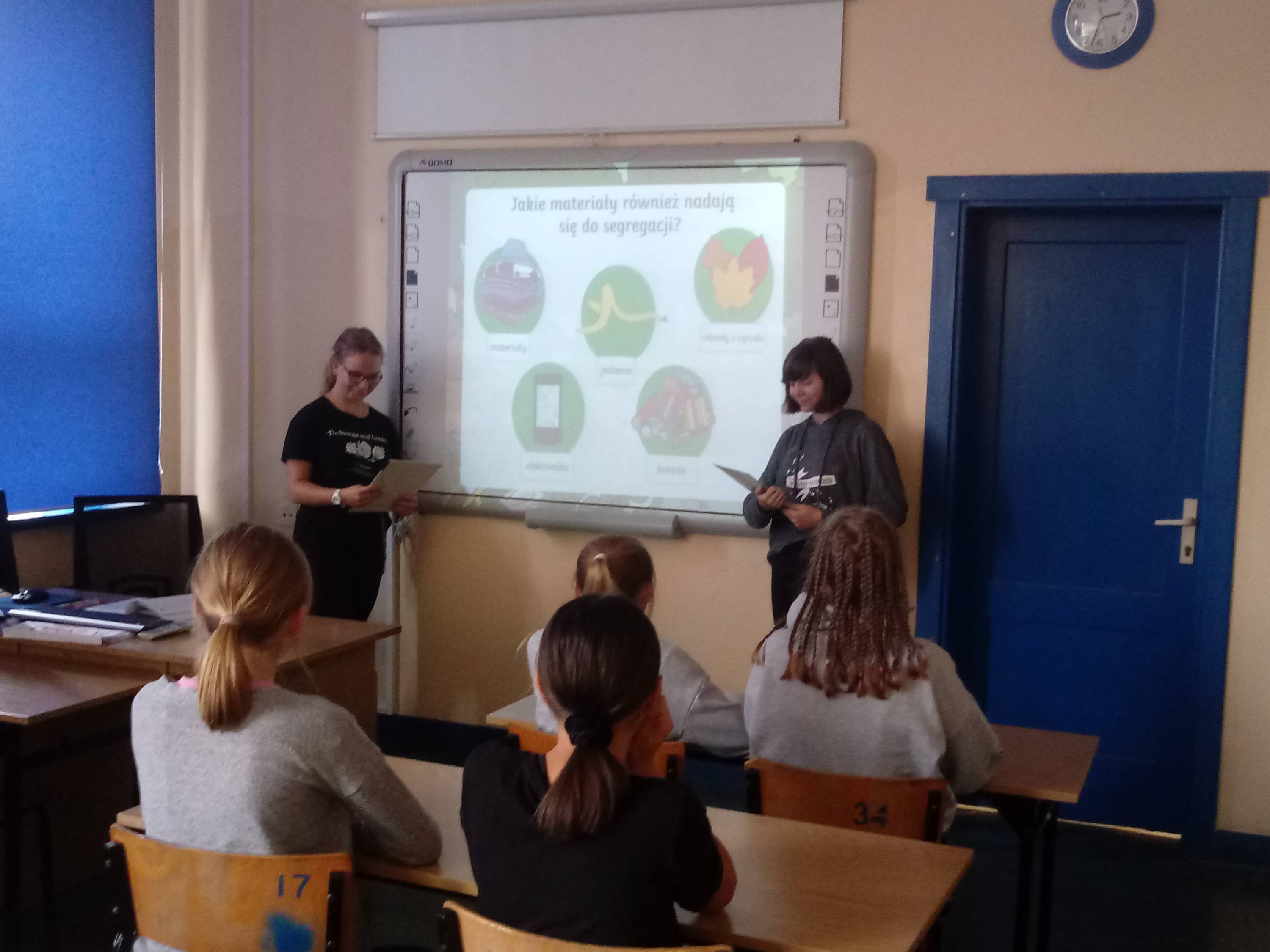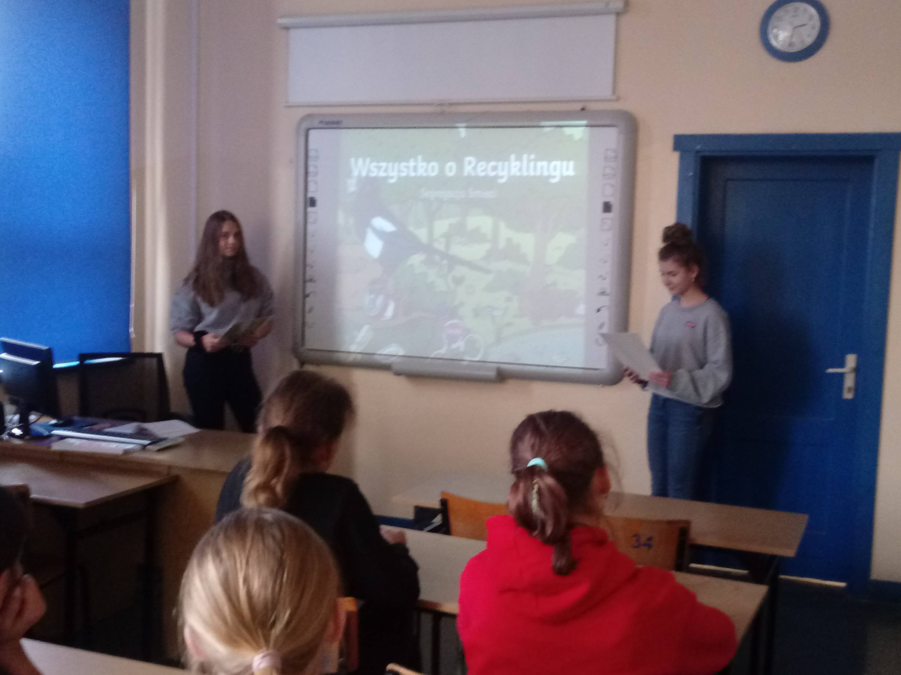 Uczniowie klasy 7a przygotowali prelekcje ekologiczne i na lekcjach edukacji wczesnoszkolnej w klasach I-III oraz na godzinach wychowawczych w klasach IV-VIII przeprowadzili zajęcia warsztatowe o tematyce ekologicznej, na których przedstawili prezentacje multimedialne pt. "Wszystko o recyklingu - segregacja śmieci".
