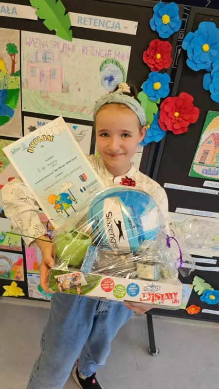 Tematyka konkursu była nie tylko twórcza, ale i niezwykle ważna – dotyczyła retencji wody, która odgrywa kluczową rolę w ochronie środowiska i przeciwdziałaniu skutkom suszy. Uczennica w swojej pracy w piękny i przystępny sposób pokazała, jak każdy z nas może dbać o wodę i przyrodę wokół siebie.