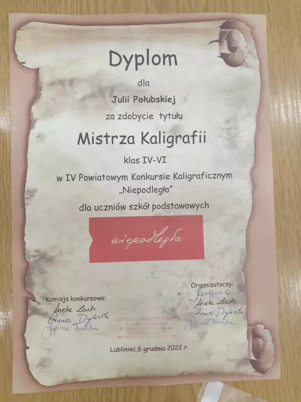 Miło nam poinformować, iż Julia Pałubska z klasy 6 b zdobyła I miejsce w Powiatowym Konkursie Kaligraficznym „Niepodległa” w kategorii klas IV –VI.