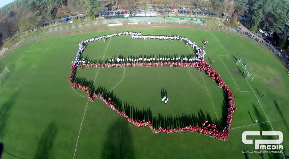 Bieg Niepodległości już po raz 9 w naszym mieście został zorganizowany przez klub sportowy META. Zawodnicy otrzymali białe i czerwone koszulki, aby stworzyć żywą flagę. Na płycie boiska powstała żywa mapa Polski z zaznaczonym na niej Lublińcem. Wykonanie takich fotografii było możliwe dzięki uprzejmości CPMEDIA.PL.