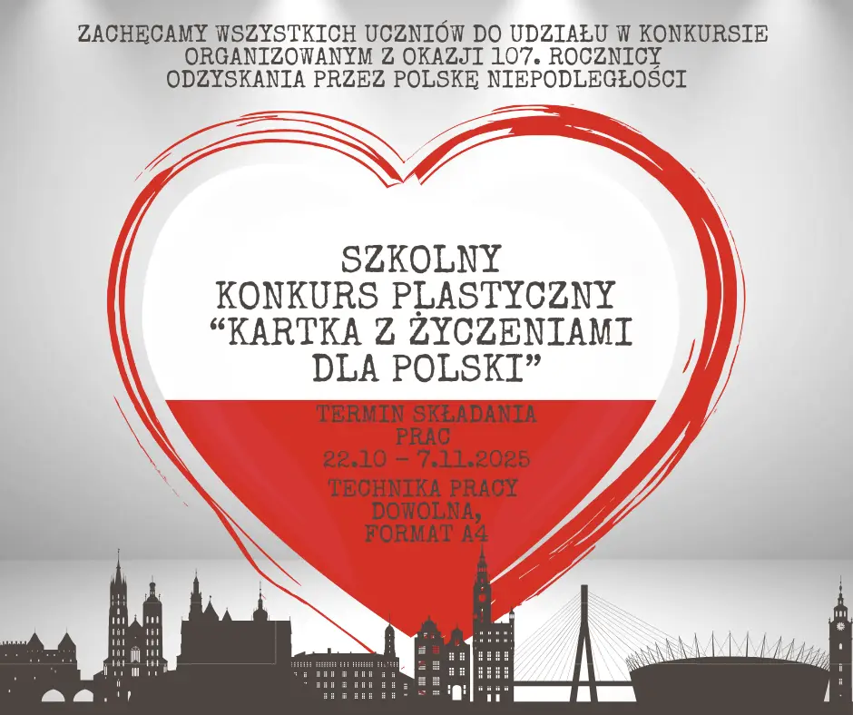 Serdecznie zapraszamy wszystkich uczniów do udziału w szkolnym konkursie plastycznym pt. „Kartka z życzeniami dla Polski”, organizowanym z okazji 107. rocznicy odzyskania przez Polskę niepodległości.