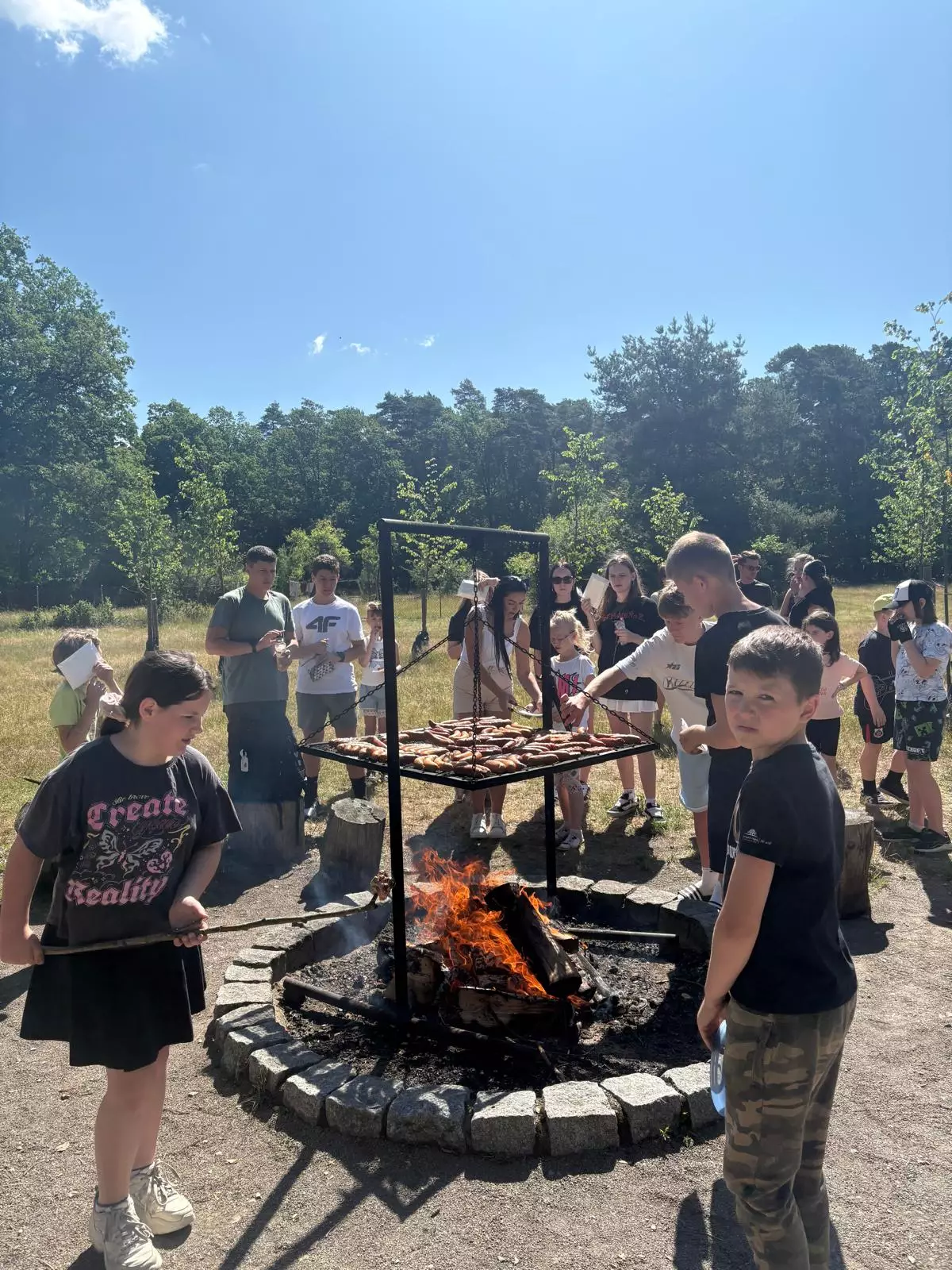 Podczas naszego pobytu w lesie nie zabrakło atrakcji – uczniowie wspólnie piekli kiełbaski przy ognisku, brali udział w zorganizowanych grach i zabawach sportowych oraz korzystali z uroków leśnej przyrody. Wszyscy z zaangażowaniem i radością uczestniczyli w przygotowanych aktywnościach.