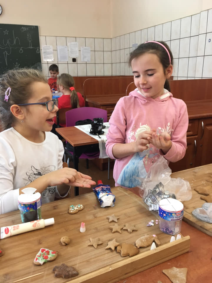 Na święta Bożego Narodzenia czekamy zawsze z niecierpliwością - to magiczny czas, który kojarzy nam się z radością, spokojem i szczęściem. Aby poczuć tę świąteczną atmosferę jeszcze przed wigilią, klasy 4 odwiedziły Zespół Szkół Zawodowych w Lublińcu, gdzie miło spędzili czas na warsztatach świątecznych. Nasi uczniowie z wielkim zaangażowaniem piekli pierniki i pięknie je dekorowali. Po kuchennych rewolucjach przyszedł czas na wspólne kolędowanie oraz tworzenie świątecznej torebki na wypieki, zabawa przy ich tworzeniu pozwoliła wszystkich wprowadzić w świąteczny nastrój. Bardzo dziękujemy ZSZ za przemiłą atmosferę i świetną zabawę.