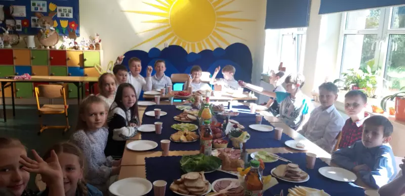 Dzieci z zapałem nakrywały i dekorowały stół, kroiły warzywa, które później znalazły się na talerzach w formie kolorowych, zdrowych przekąsek. Gdy wszystko było gotowe, uczniowie zasiedli do wspólnego stołu. Nie zabrakło tradycyjnych kraszanek, pieczywa i wielkanocnych babeczek. Najważniejsze jednak były chwile spędzone razem – rozmowy, śmiech i wzajemna życzliwość wypełniły klasę.