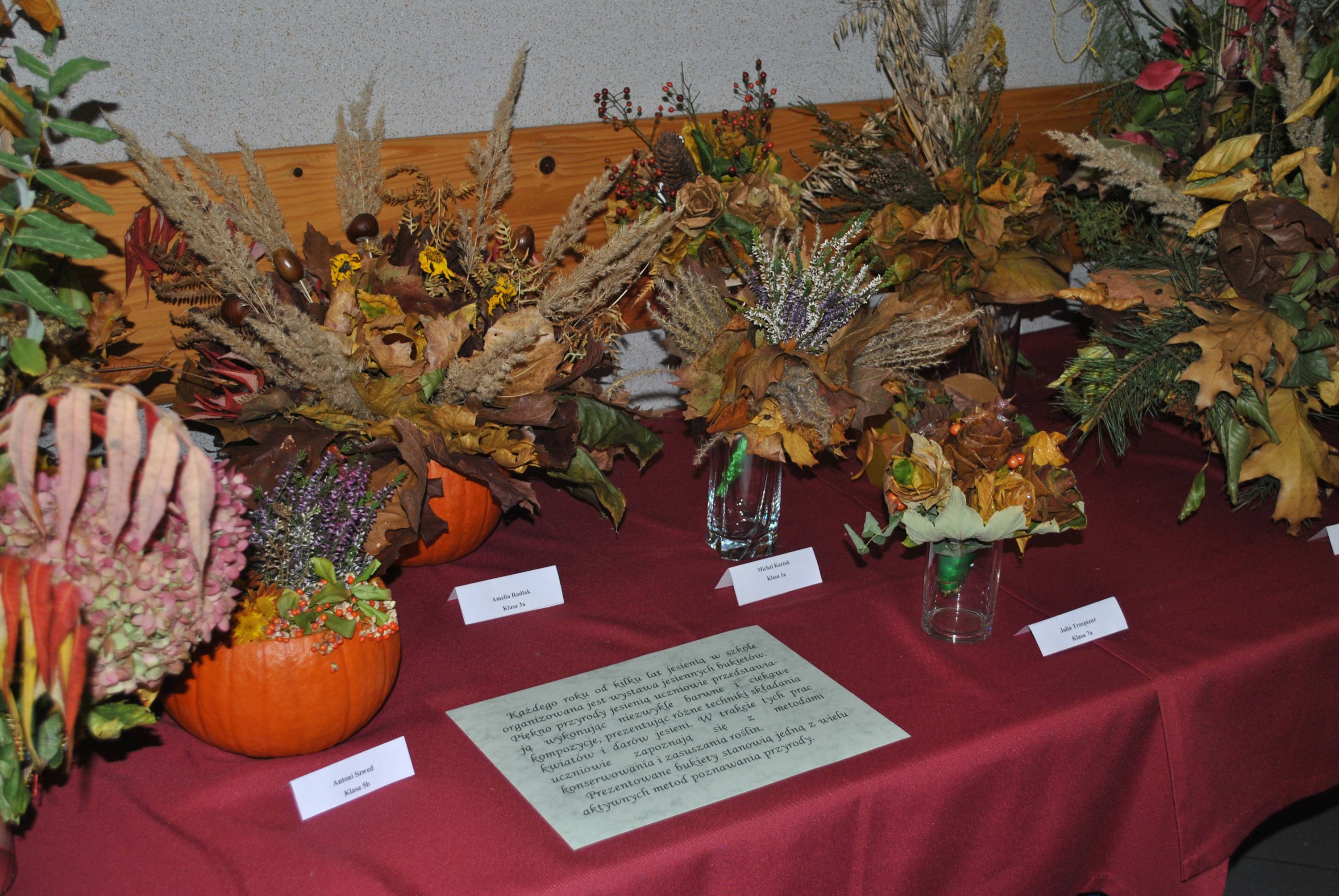 Gdy kończy się piękne i upalne lato już zaczynamy marzyć o tym, kiedy znów w ogrodzie pojawią się nowe kwiaty i świeża zieleń. Wiele roślin rosnących w naszych ogrodach znakomicie nadaje się do zasuszenia. Można z nich wyczarować piękne suche bukiety i kompozycje roślinne, które w zimowe miesiące będą zdobić nasze wnętrza. Kompozycje z suchych kwiatów i roślin nie podlegają żadnym ścisłym zasadom. Rodzaj bukietów zależy od tego, co chcemy nimi udekorować i jakimi materiałami dysponujemy. Najefektowniejsze są bukiety mieszane na wzór tzw. francuskich bukietów barokowych. Doskonale wyglądają one szczególnie w starych, zabytkowych naczyniach miedzianych, posrebrzanych, cynowych lub porcelanowych. Do swobodniejszych kompozycji możemy wykorzystać naczynia o zupełnie innym przeznaczeniu, np. nietypowe wazony. Uczniowie naszej szkoły od wielu lat również wykonują piękne i oryginalnie bukiety. Suche naręcze kwiatów nigdy nie wychodzą z mody. Finezyjne kompozycje o zarówno delikatnych odcieniach, jak i nasyconych kolorach zdobią i wzbogacają ciepłymi barwami pochmurne jesienne dni i utrwalają nasze miłe wspomnienia.