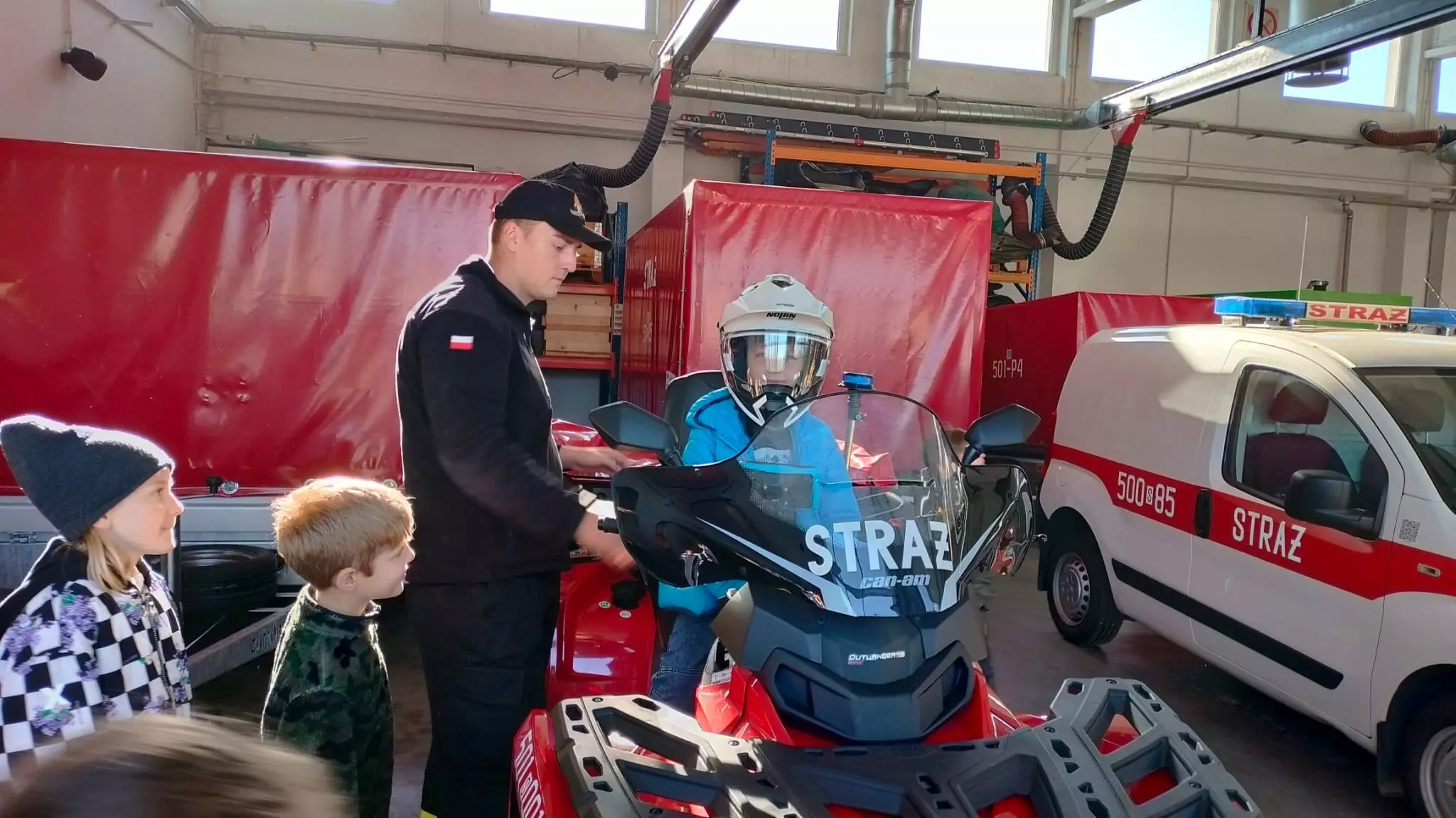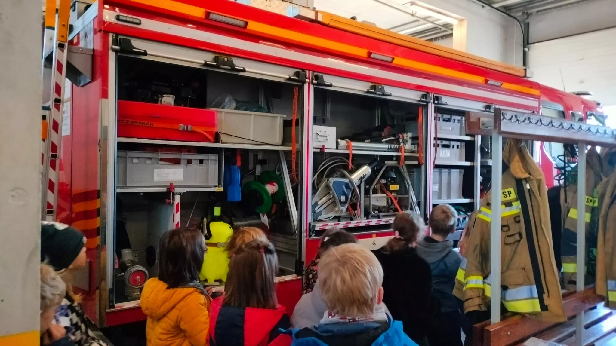 Następnie uczniowie mieli okazję zobaczyć z bliska pojazdy strażackie oraz sprzęt wykorzystywany podczas akcji ratowniczych. Strażacy prezentowali wozy bojowe, specjalistyczny sprzęt gaśniczy oraz różne urządzenia używane w sytuacjach kryzysowych, takich jak wypadki drogowe czy katastrofy naturalne. Dzieci mogły wejść do pojazdów, co sprawiło im ogromną frajdę.
