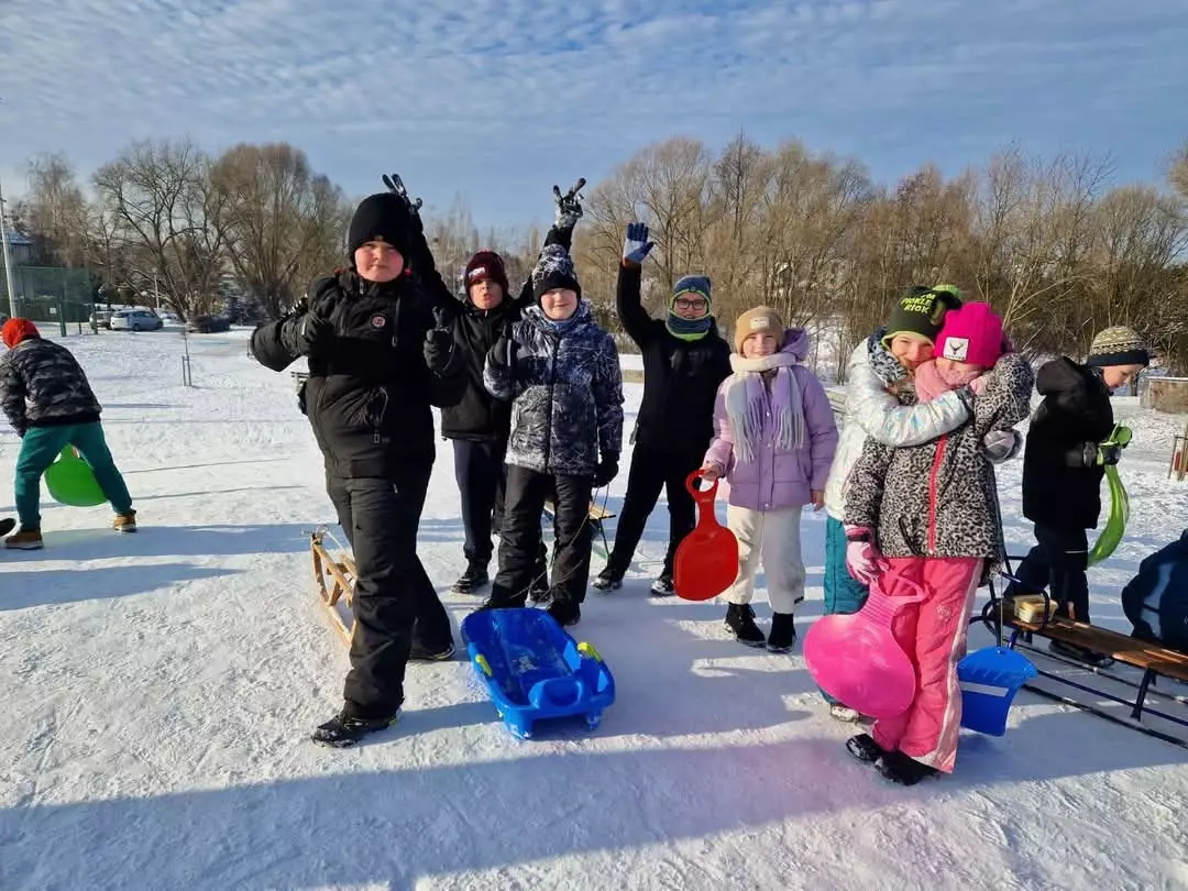 Dnia 14 stycznia br. uczniowie klasy 2a i 4a spędzili aktywne przedpołudnie na pobliskiej górce ciesząc się zimową aurą. Dzieci z radością zjeżdżały na sankach, lepiły bałwany i uczestniczyły w zabawach ruchowych. Starsi uczniowie chętnie pomagali młodszym kolegom, co sprzyjało integracji międzyklasowej. Wspólne chwile na świeżym powietrzu dostarczyły wszystkim mnóstwo uśmiechu i energii, wzmacniając więzi koleżeńskie. Na zakończenie wszyscy wrócili do szkoły pełni pozytywnych wrażeń i gotowi do dalszej nauki.