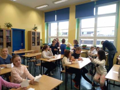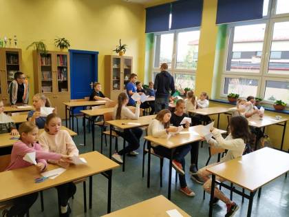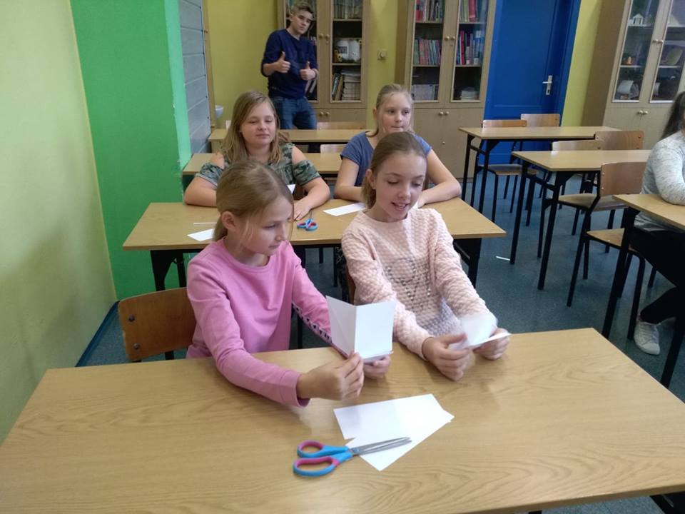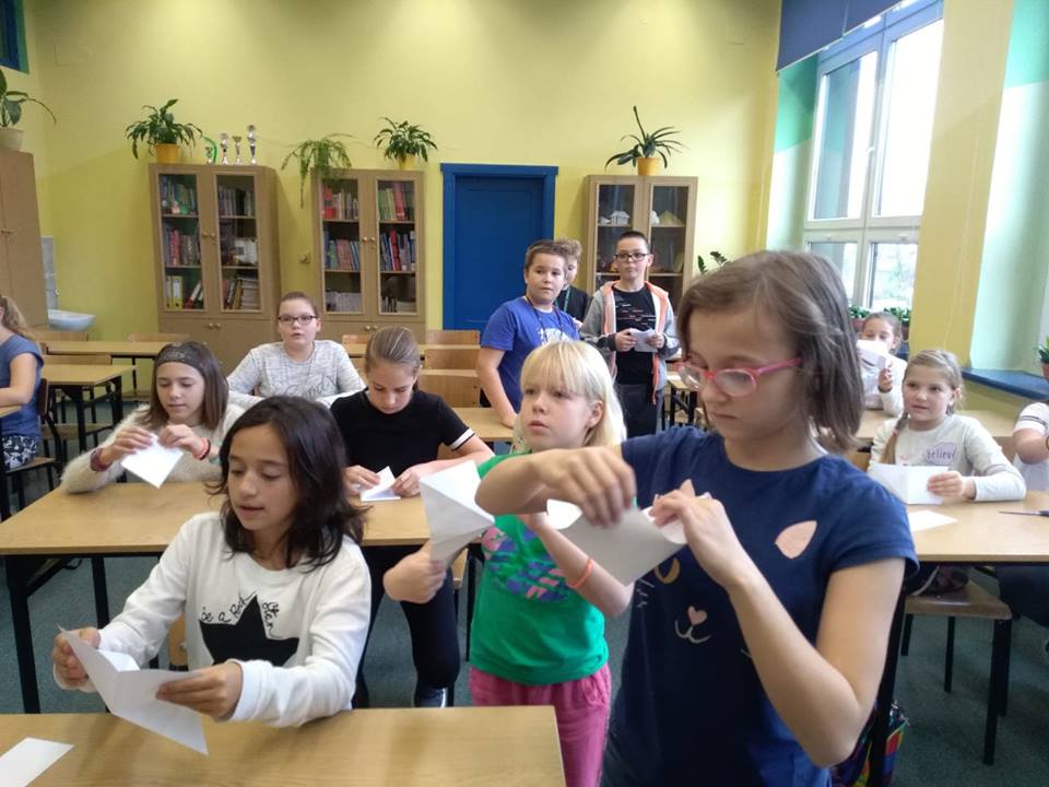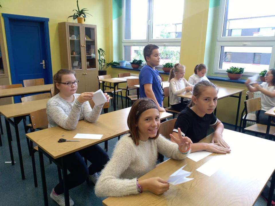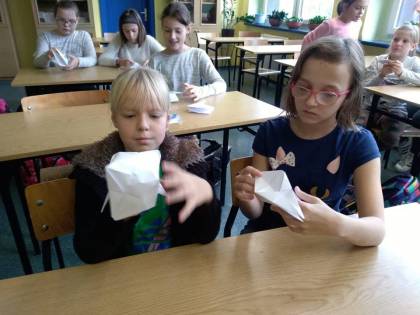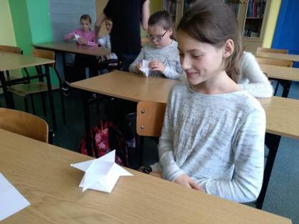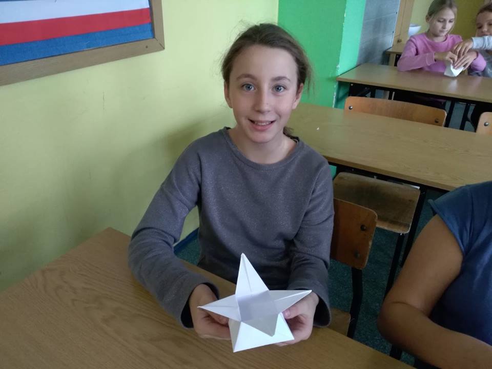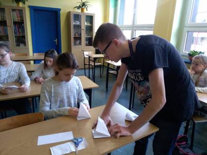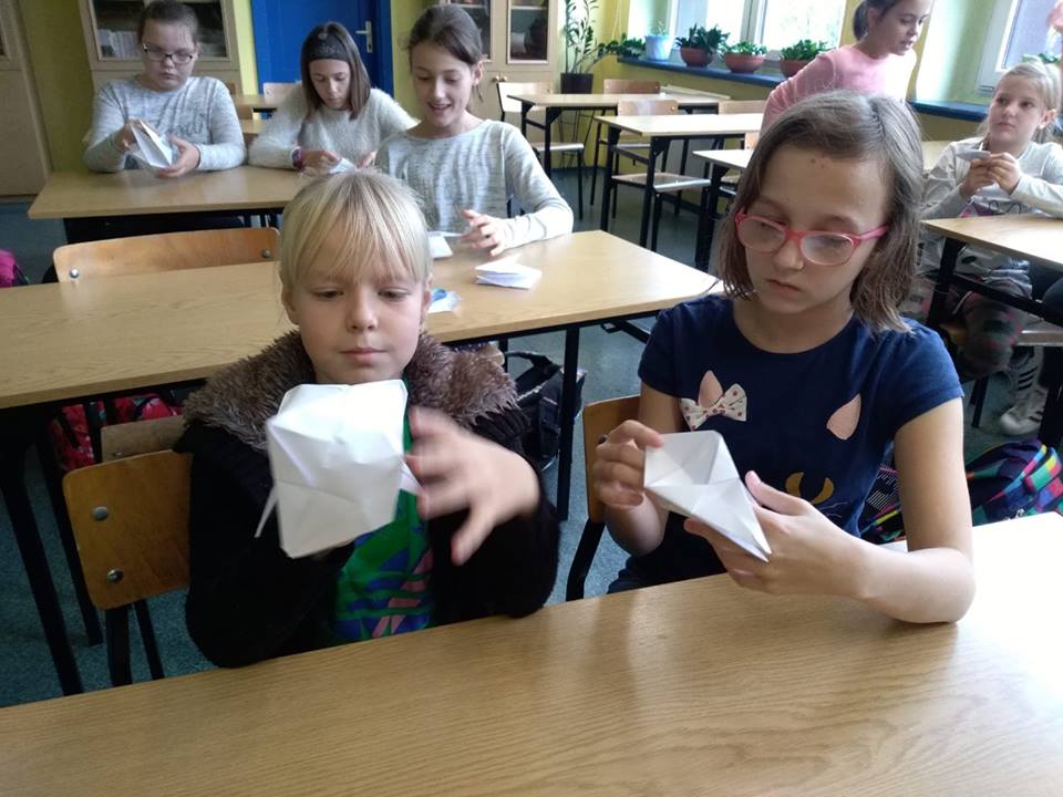 Dnia 9.11.2018 r. w naszej szkole podczas przerw odbyły się zajęcia z origami przeprowadzone przez Remigiusza, ucznia klasy 3b. Warsztaty cieszyły się dużym zainteresowaniem młodszych kolegów i koleżanek. Wszyscy z uwagą i zaangażowaniem, krok po kroku wykonywali polecenia Remika, tak aby jak najlepiej wykonać zadanie. Jak się okazało wszystkim uczestnikom udało się poprawnie wykonać ćwiczenie i każdy otrzymał drobny upominek. Bardzo dziękujemy Remigiuszowi i czekamy na kolejne zajęcia!